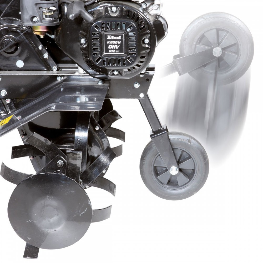 Передаточне переднє колесо культиватора спрощує транспортування до місця оранки і піднімається для полегшення роботи на землі.